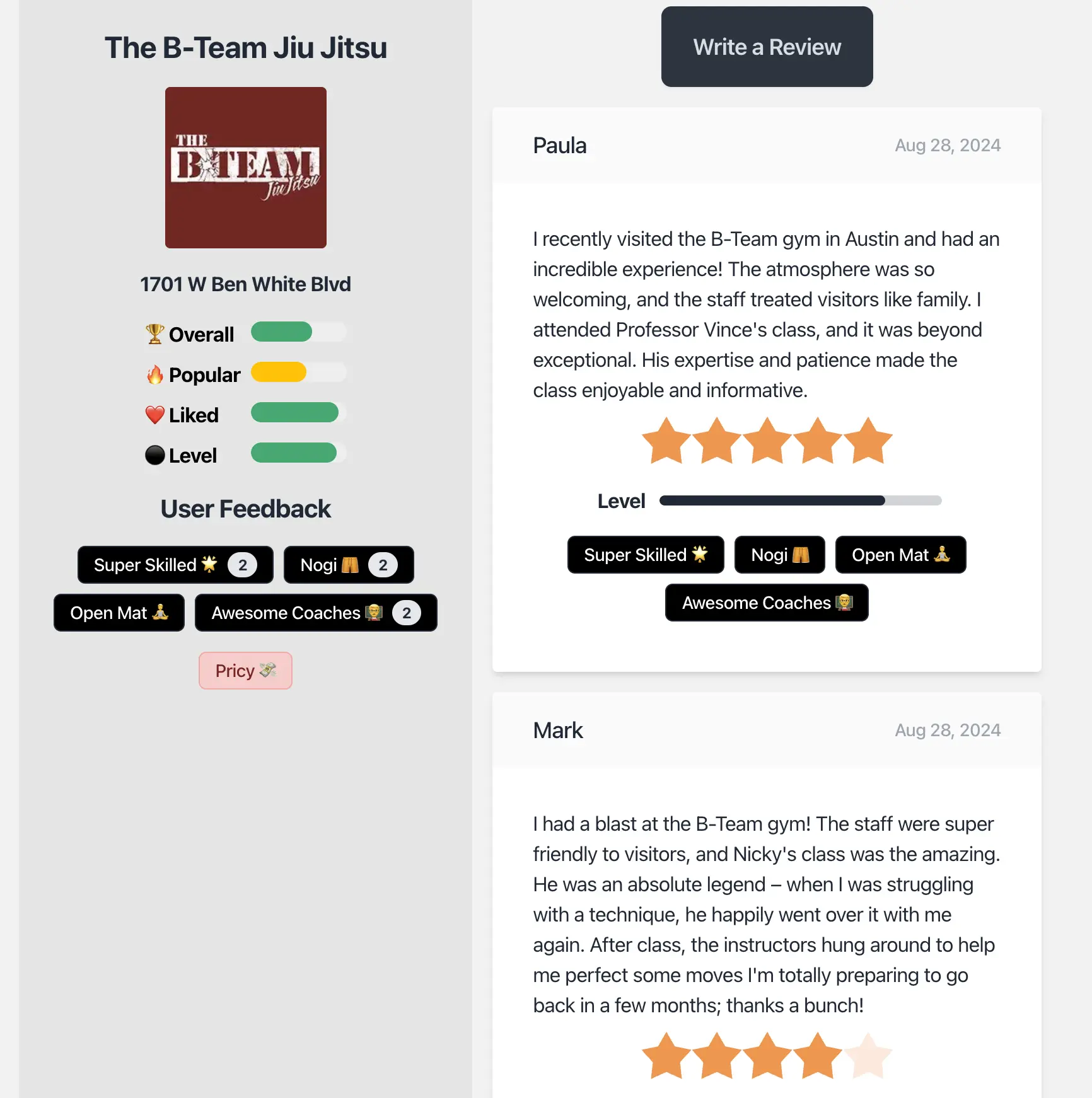 BJJGym.com is a comprehensive online platform that connects Brazilian Jiu-Jitsu (BJJ) practitioners with gyms tailored to their preferences, location, and goals. The website offers a worldwide network of gyms, catering to both local students and visiting drop-ins. Users can share their experiences and rate gyms, while the filtering system allows for easy discovery of casual or competition-focused dojos. Moreover, gym owners can effectively showcase and manage their academies, ensuring a seamless experience for all users.
