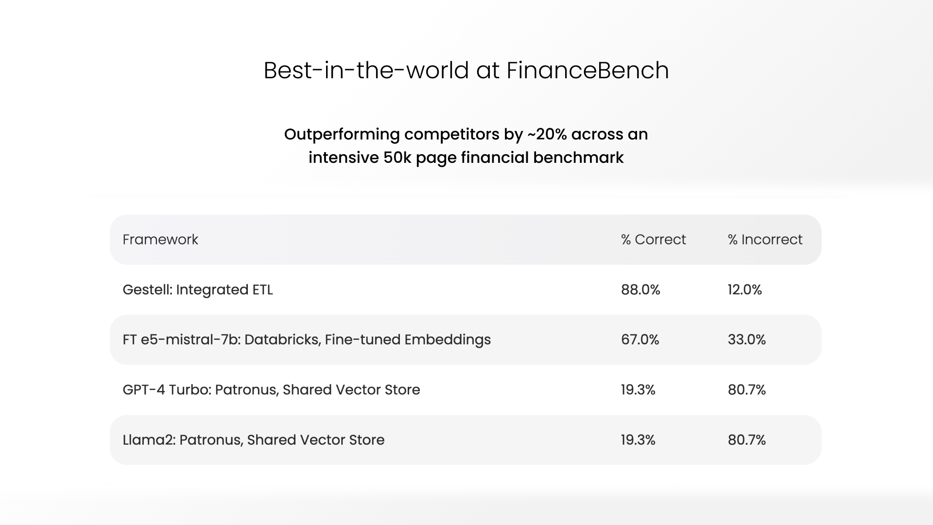 Scaling a search-based reasoning system for an LLM is incredibly costly and nearly impossible with the current landscape of tools. The current patchworked landscape of RAG is full of point solutions that take months to build and won’t even scale to production-level databases. Your model with PhD level intelligence shouldn’t struggle to understand a database. Gestell fixes this through our integrated ETL, enabling out-of-the-box structuring that will work at scale for your model