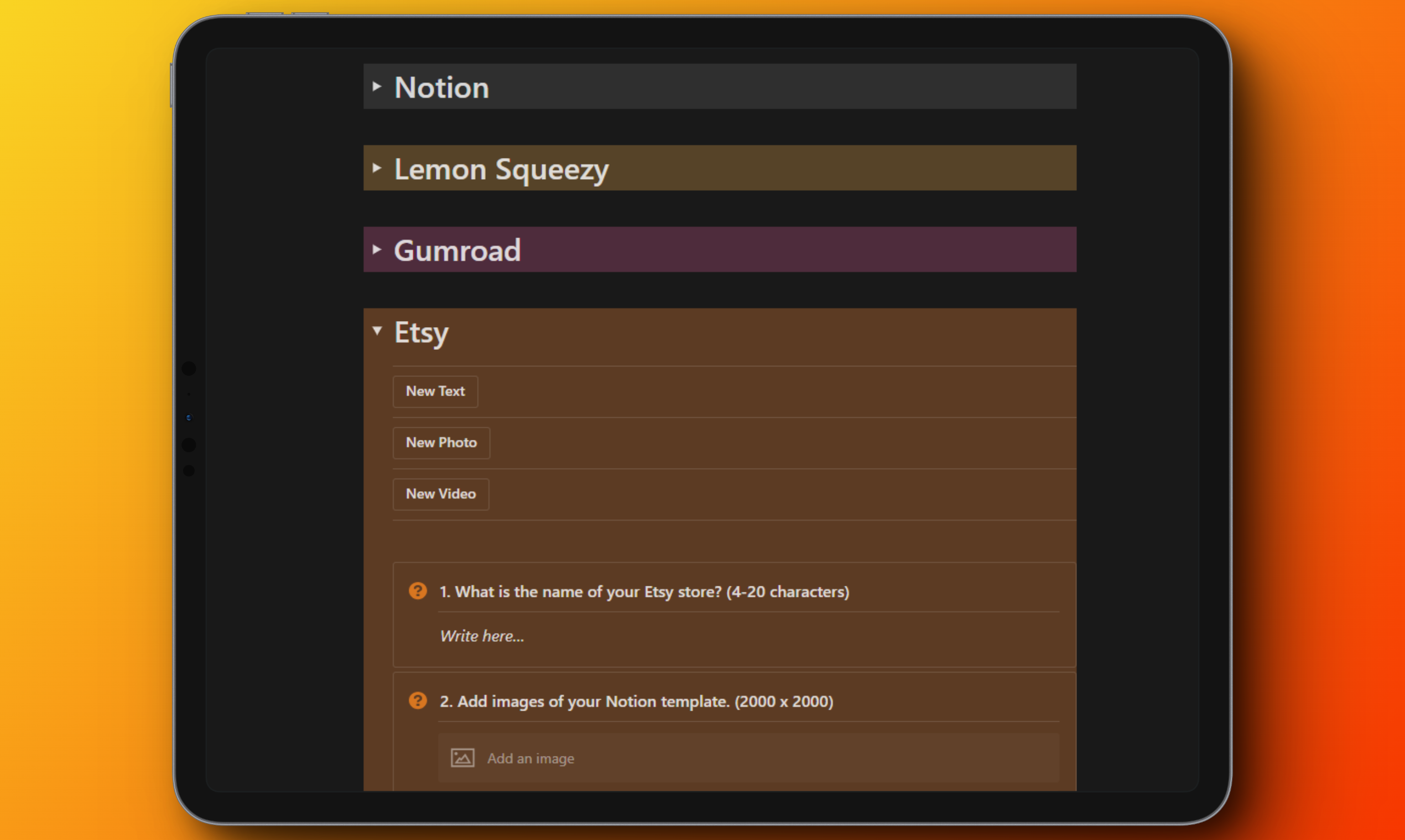 Hi Faziers! 🚀 I'm excited to introduce the Notion Template Checklist. As someone new to creating Notion templates, I had a hard time creating templates. I encountered many questions such as "What subject will I produce a template for, how will it be designed, when will the template be finished, how will it be added to the store, how will Product Hunt be launched, how will it be promoted on social media?” I could not finish this template in time because I proceeded without a plan and added ideas that came to my mind from time to time. There were constant delays. I'm sure a lot of people suffer from these problems. I developed this template so that subsequent template production processes are more planned and time-saving. This template includes: ❓1100+ Questions ✅ 20 Checklists of 1000+ Items 👥 250 Etsy Groups 👥 102 Notion Groups 👥 81 Product Hunt Groups 👥 4 Gumroad Groups 🛒 29 Notion Markets 🟡 24 Categories (Notion Markets, Social Media Platforms) - You will save hours/days of research with the Notion Template Checklist. - Before you start the template production, you will ask yourself questions, and what your next template will be like will be shaped in your mind. - After producing the template, you will easily add it to the stores and launch the Product Hunt. - By doing the necessary before sharing your template on many social media platforms, you will perform an effective promotion. - By sharing your template in 437 groups, you will reach a lot of people in a short time. I'd love to hear your thoughts, feedback, and questions. I wish everyone good luck in producing Notion templates. 😊