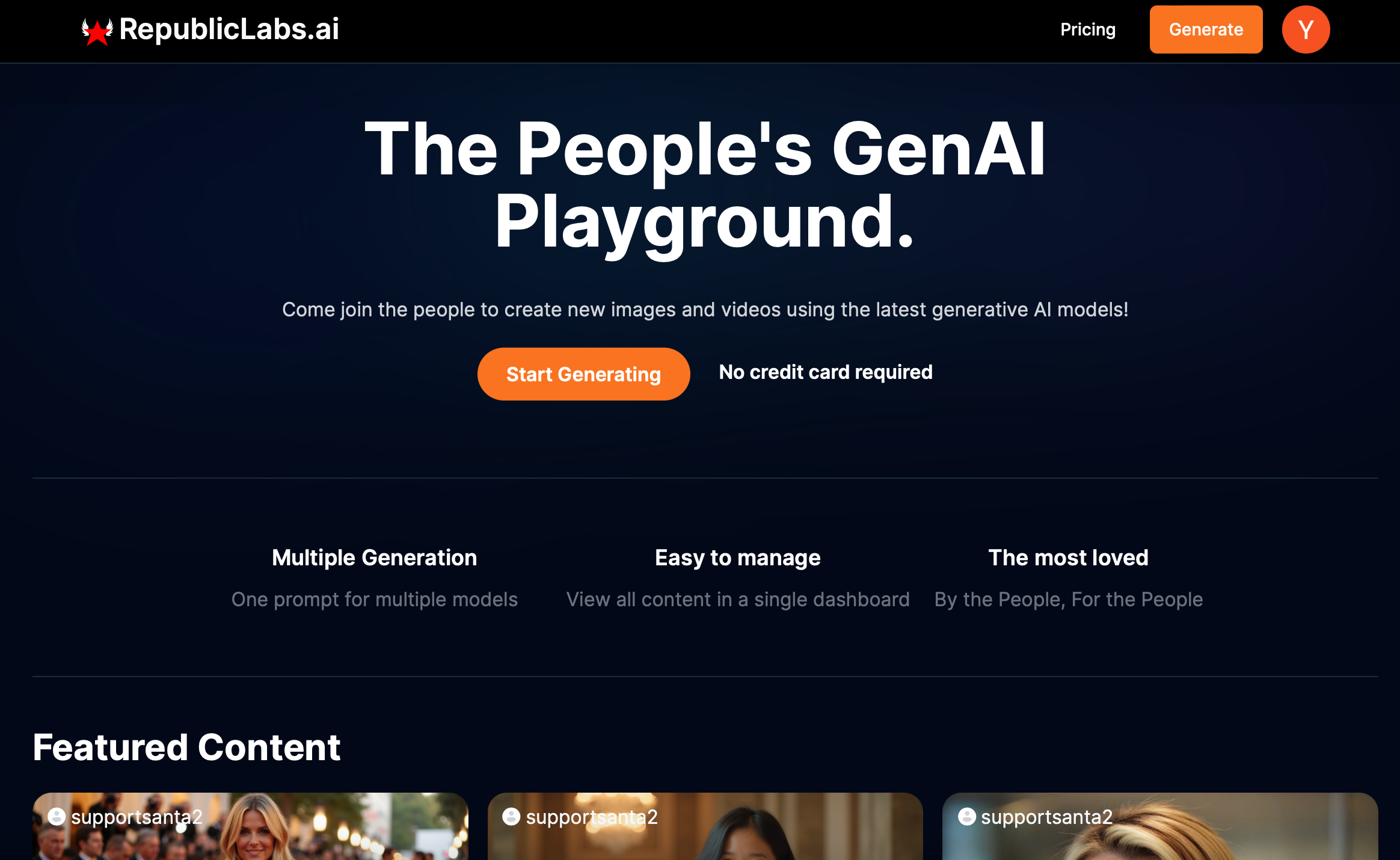Republiclabs.ai is a comprehensive AI generative platform that allows users to generate images and videos with multiple models simultaneously with a single prompt. Users can select from text-to-image, image-to-video, text-to-video options and generate content without any training or skills. The platform prioritizes ease of use and intuitive user experience. Some of the notable models available are Flux, Luma AI Dream Machine, Minimax, and Pyramid Flow which are the latest advancements in AI image and video generation. In addition, the platform also has AI Professional Headshot generator that can generate great looking professional headshots with a simple selfie, perfect for a quick LinkedIn photo. Lastly, the platform has a AI Product Photography generator that can generate product advertisement photos from a product photo taken on a phone and a description of the product advertisement background. The website has monthly subscription options as well as a no-commitment one time credit pack for those who are looking to explore and don't want to sign up for a monthly plan. The platform will also constantly be updated to include the latest and greatest models so that the people can generate and visualize anything in their imagination.