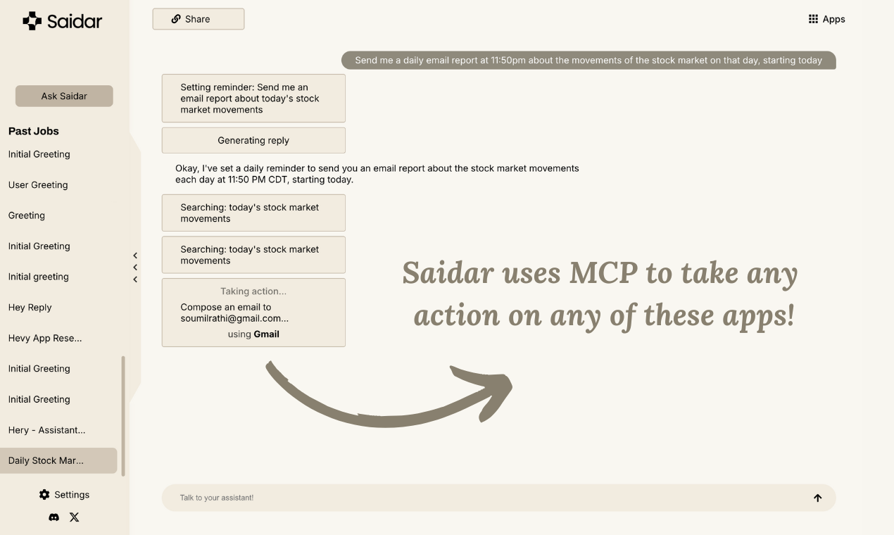 Saidar is an intelligent personal assistant that uses MCP to integrate with 50+ apps like Gmail, Notion, and Slack to take real world actions for you.