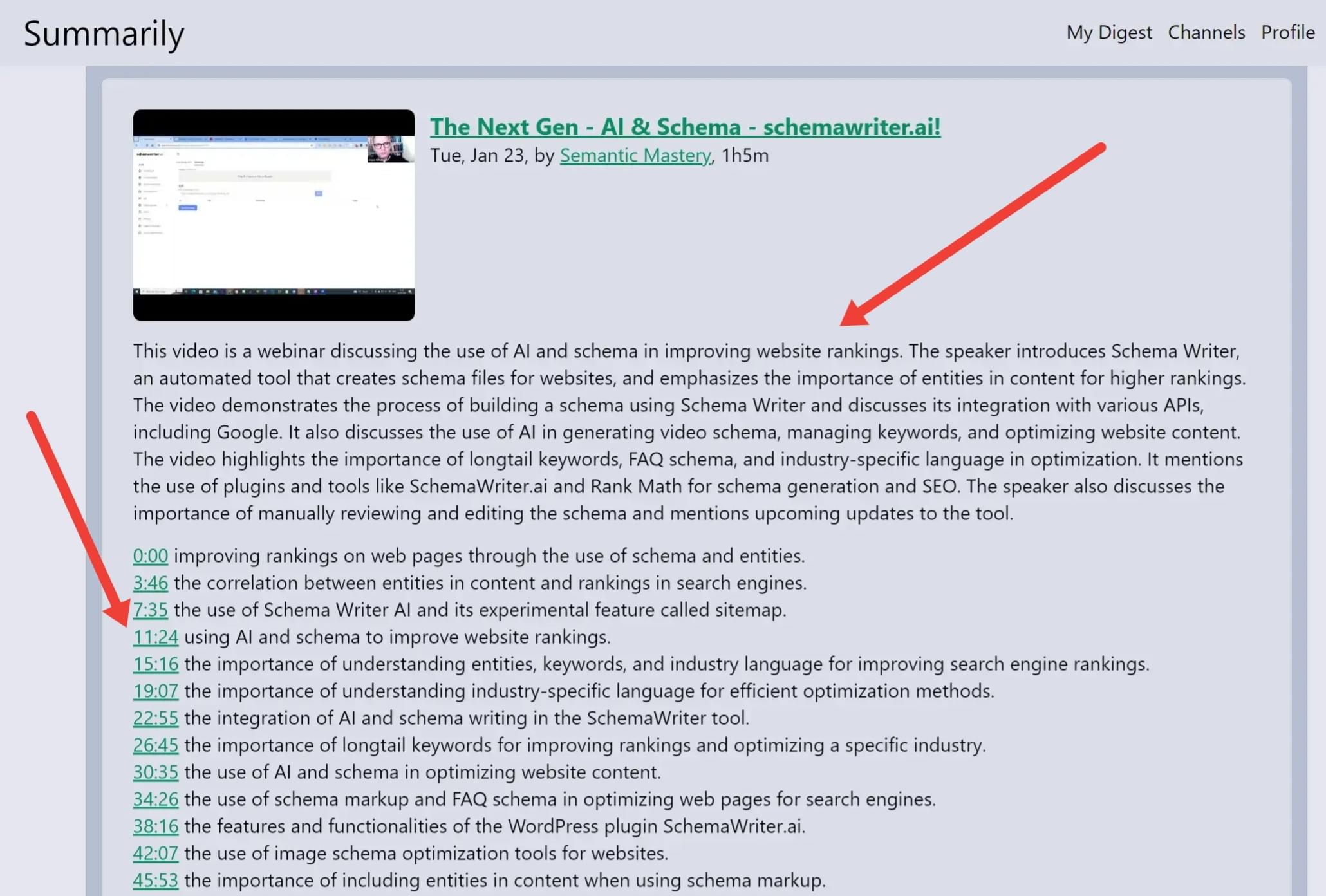 This started as a script I created to help stay on top of the great videos from high signal channels I liked. I wanted to go several steps further and automate the process so that ALL new videos from my subscriptions were summarized and broken down with timestamped summaries - after that I started using Summarily with other tools like Readwise Reader and Feedly to get the most out of my YouTube subscriptions.