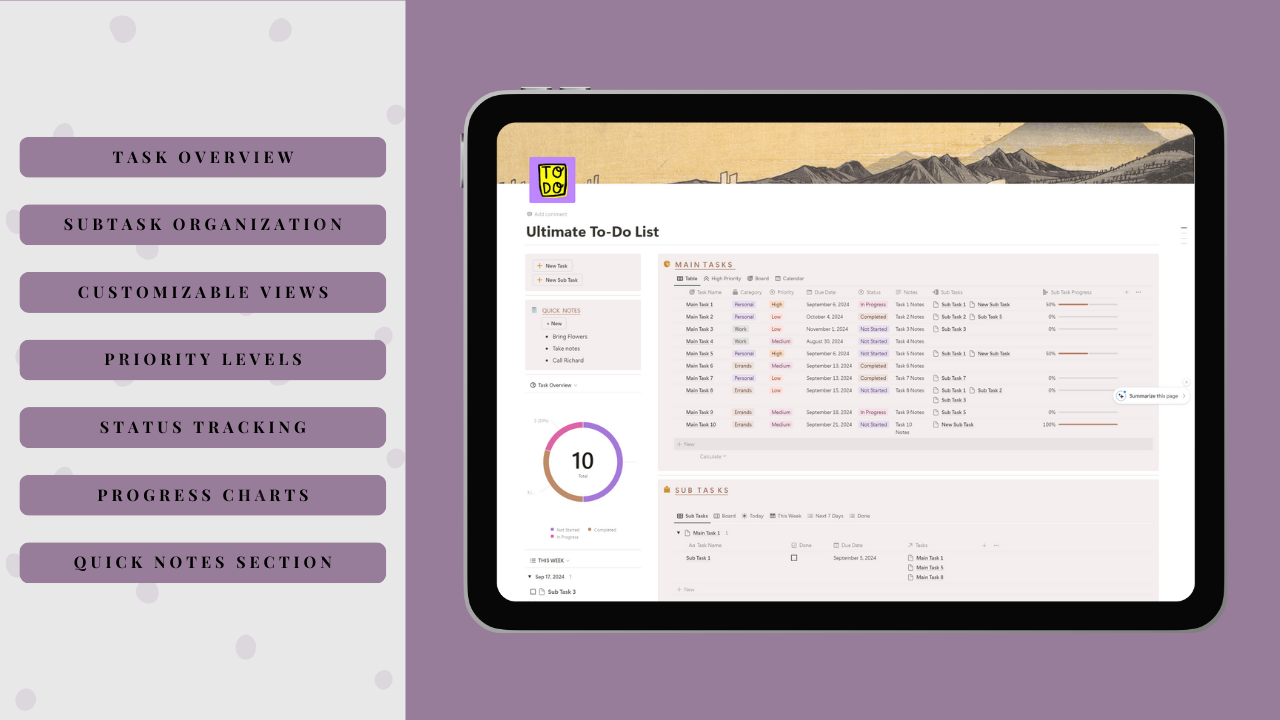A complete Notion-based to-do list system featuring tasks, subtasks, priority levels, Kanban, and calendar views. Perfect for anyone looking to manage their daily, weekly, and long-term tasks efficiently.