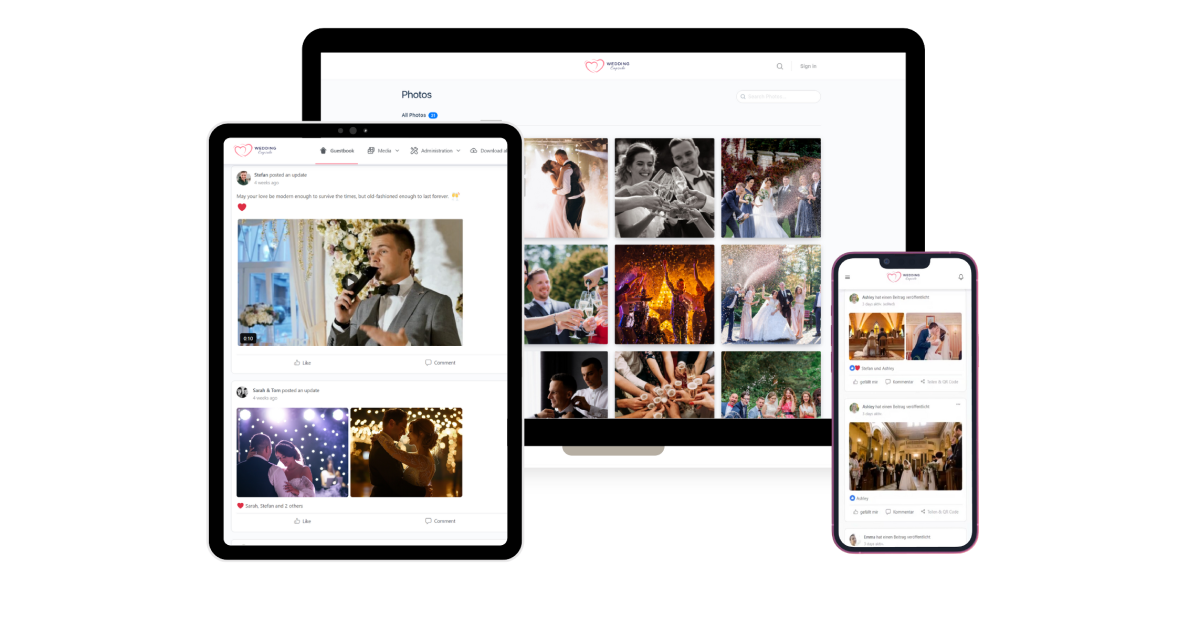 After the wedding, reminders are sent to guests, encouraging them to upload additional photos and videos they may have taken. The couple receives all these contributions—text, images, videos, and audio messages—organized into a stunning timeline, creating a complete story of their wedding day.
